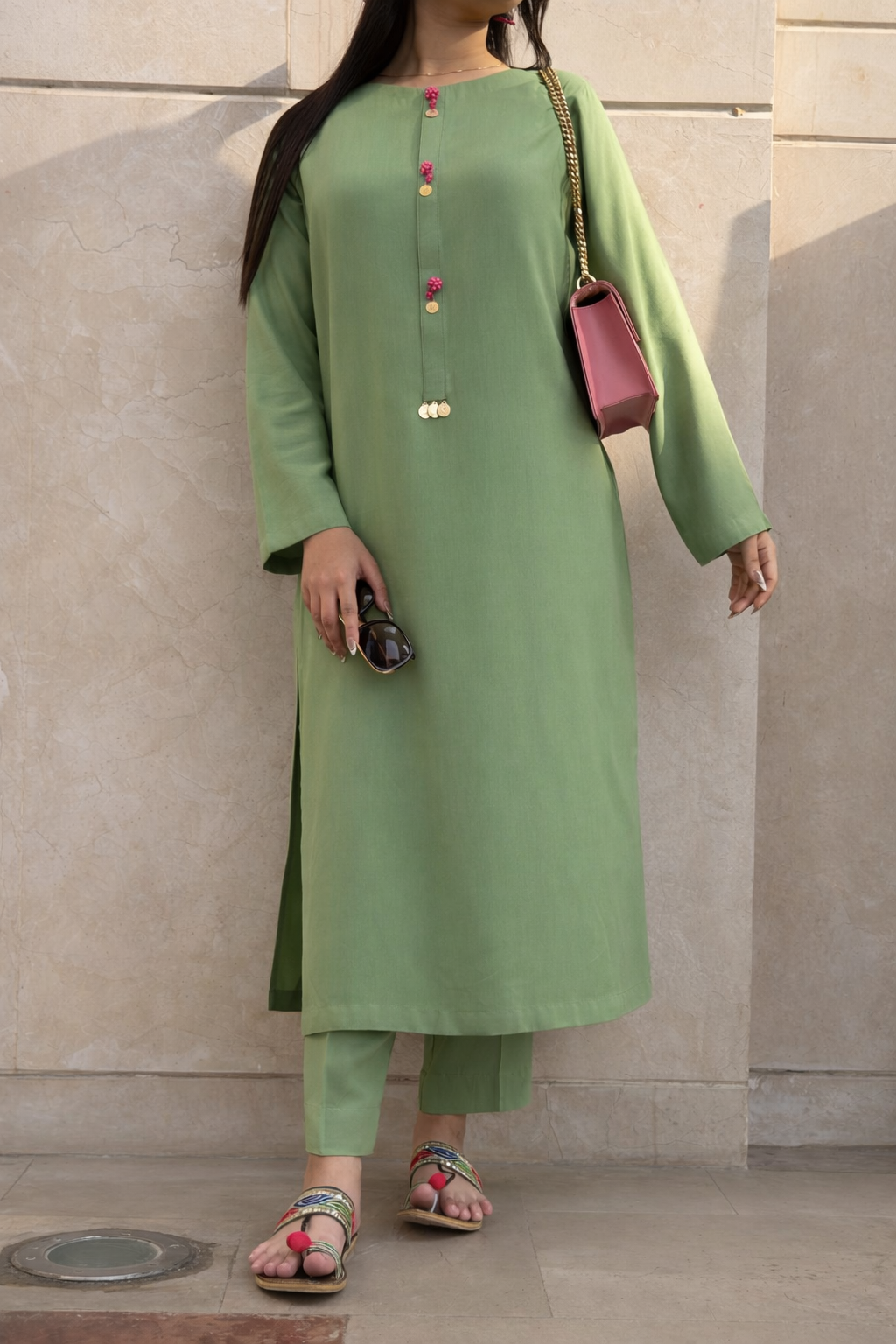 The Ilana ensemble is a breath of fresh air, blending minimalist chic with playful traditional accents. Rendered in the most summer Green color, this co-ord set features a sleek, straight-cut long kurta with a classic boat neckline.